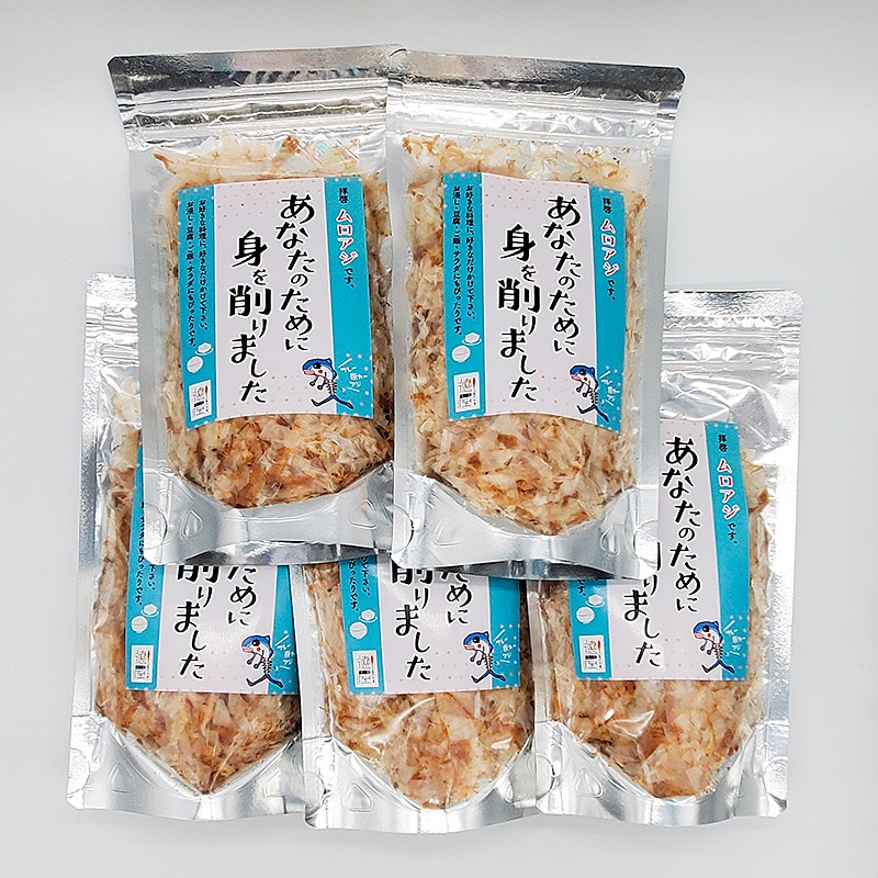 ムロアジ節は、麺出汁や煮物などによく使われる節でプロの料理人も使う美味しい節です。香りよりも味が特徴的な節で、甘みがあり噛めば噛むほど魚の旨味が感じられます。出汁用として厚削りに加工されることが多いですが、弊社が培ってきた職人技で丁寧に薄削りにしました。ご飯や豆腐、サラダなど、料理の味を引き立てながら、節の旨味を感じることができる商品です。