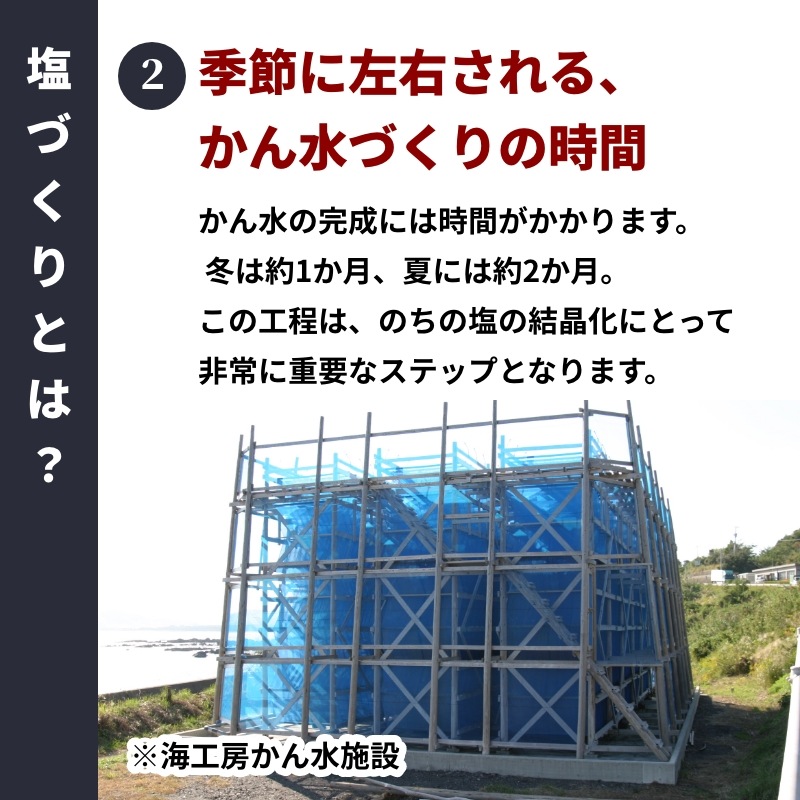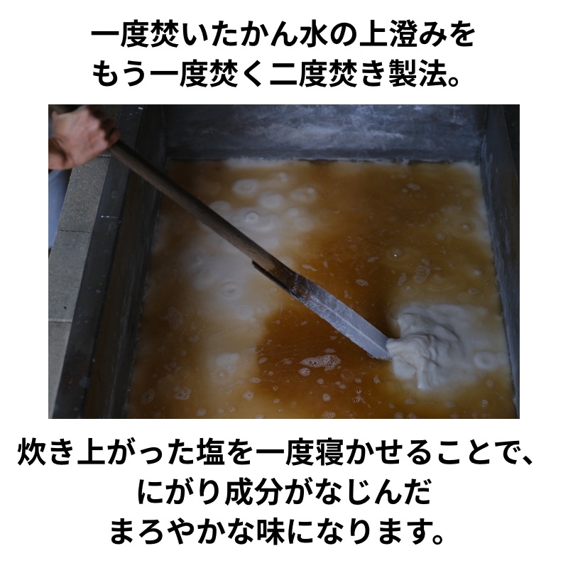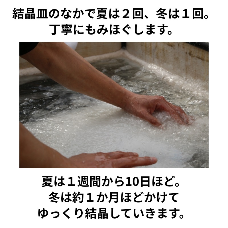 季節に応じて、夏は1日2回、冬は1回、すべて手作業で丁寧に揉みほぐすことで、さらさらとした粒立ちの良い塩に仕上げています。