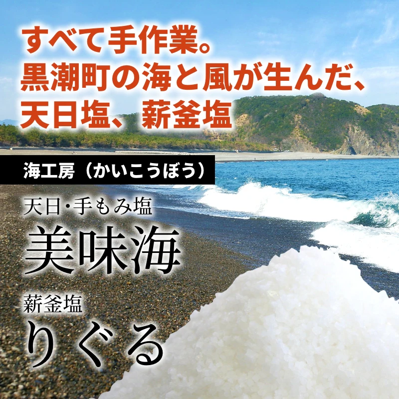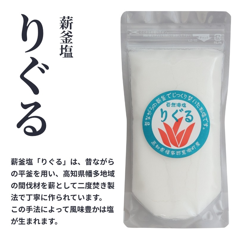一方、薪窯塩「りぐる」は、地元・幡多地域の間伐材を薪として活用し、昔ながらの薪窯でゆっくりと炊き上げる塩。